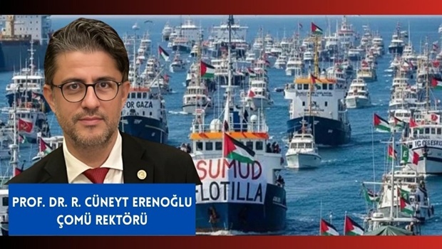 İsrail’in uluslararası sulardaki hukuksuz müdahalesine ilişkin ÇOMÜ Rektörlüğü kınama mesajı yayınladı. Çanakkale Onsekiz Mart Üniversitesi Rektörü Prof. Dr. R. Cüneyt Erenoğlu imzası ile yayınlanan kınama mesajında şu ifadeler yer aldı; “Gazze halkına insani yardım ulaştırmak için yola çıkan Küresel Sumud Filosu’na uluslararası sularda İsrail tarafından gerçekleştirilen saldırı, yalnızca bir hukuk ihlali değil, insanlık onuruna vurulmuş açık bir darbedir. Bu eylem, masum sivillerin hayatını hiçe sayan, uluslararası vicdanı yaralayan ve devlet terörünün en çıplak örneğini sergileyen bir saldırganlıktır.