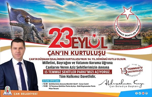 23 Eylül Çan’ın Düşman İşgalinden Kurtuluşunun 94.Yıldönümü etkinlikleri kapsamında “15 Temmuz Şehitler Parkı” açılıyor.