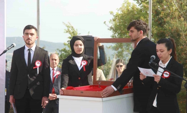 Çanakkale Kara Savaşları'nın 108'inci yıl dönümü nedeniyle 57'nci Alay Vefa Yürüyüşü anma programı çerçevesinde Conkbayırın'daki Atatürk Anıtı'nda 57'nci Alay Sancağı temsili devir teslim töreni gerçekleştirildi.