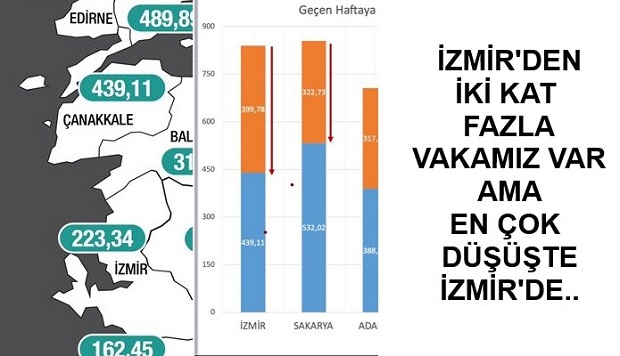 Bakan Koca, yaptığı paylaşımda İzmir'de 100 bin kişi başına vaka sayısının 399,78 azalarak 439,11'e düştüğünü belirtti. Ancak Sağlık Bakanlığı'nın haftalık vaka haritasına göre bu ilin İzmir değil, Çanakkale olduğu görülüyor.