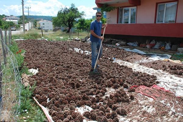 “Dünyada en kaliteli ürün İtalya ve ülkemizde elde edilmektedir. Çin, Pakistan ve Hindistan gibi ülkelerde yetişen ağaçlardan elde edilen çam fıstıkları lezzet, kalite ve büyüklük standartlarına uygun olmadığı için rağbet görmemektedir. Elde edilen ürünler ağırlıklı olarak Almanya ve Arap ülkelerine satılmaktadır. Ülkemizde ise üretilen çam fıstığının yüzde 5’i kullanılmaktadır. Geçtiğimiz sezon yaklaşık olarak 50 ton çam fıstığı kozalağı topladım. 50 ton kozalaktan yaklaşık 5 ton civarında çam fıstığı elde etmeyi hedefliyorum. Çanakkale bölgesinde benim dışımda işleme yapan kimse yok. Bu işi 9 yıldır yapıyorum. Kozalakları ise köy meralarına ekilmiş çam fıstığı ağaçlarından ve vatandaşın ormanlık bölge yakınlarındaki arazilerine diktiği ağaçlarından alıyorum" dedi.