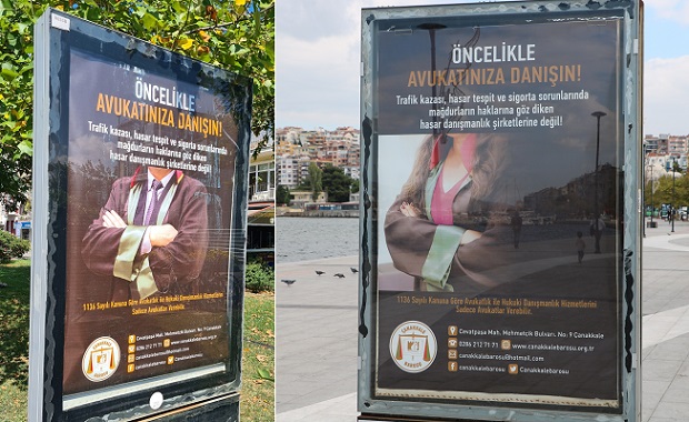 Çanakkale Barosu, kent halkının trafik ya da iş kazalarından doğan ihtilaflarda mağduriyet yaşamaması ve haklarına doğru yoldan ulaşabilmesi amacıyla Çanakkale’nin çeşitli yerlerindeki billboard ve raketlerde, yasa dışı çalışan danışmanlık şirketlerine karşı halkı bilgilendirici ilanlar verdi.