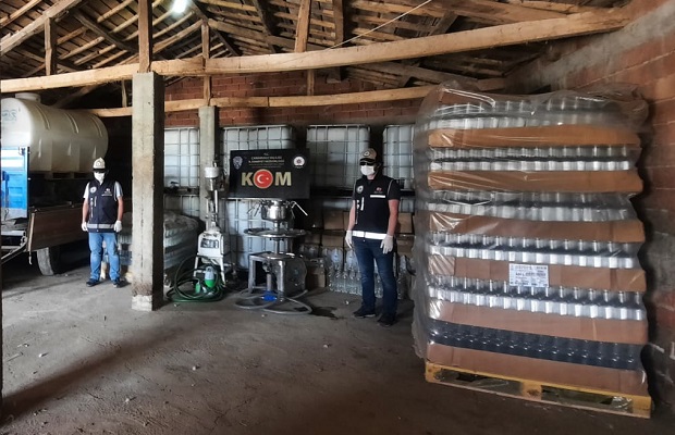 Öte yandan, eş zamanlı yapılan baskınlarda; 1 adet ruhsatsız Kırıkkale marka 6136 SKM tabanca, 2 adet 9mm lik tabanca mermisi, tabancaya ait 1 adet şarjör, 94 adet1 lt lik dolu ZERNOFF marka etil alkol, 67 adet 1 lt lik NOVA marka etil alkol,5 adet boş 1 lt lik ZERNOFF markalı etil alkol şişesi, 60 Litre Etil Alkol, 160 adet 20 ml anason aroması, 7 adet 20 ml. Anason yağı, 12 adet 20 ml. malt aroması, 9 adet 1 tonluk ve 1 adet 2 tonluk toplamda 11 tonluk plastik depo, 2890 adet 1 lt lik boş cam şişe, 156 adet boş kullanıma hazır 5 lt boş bidon, 30 adet kullanılmamış şişe kolisi, 200 adet şişe ayırma kartonu, 1 adet şişe doldurma makinesi, 1 adet şişe kapaklama makinesi, 1 adet şişe dolumu standart pompası ve 1 adet şişe dolumu süzgeç pompası ele geçirildi.
