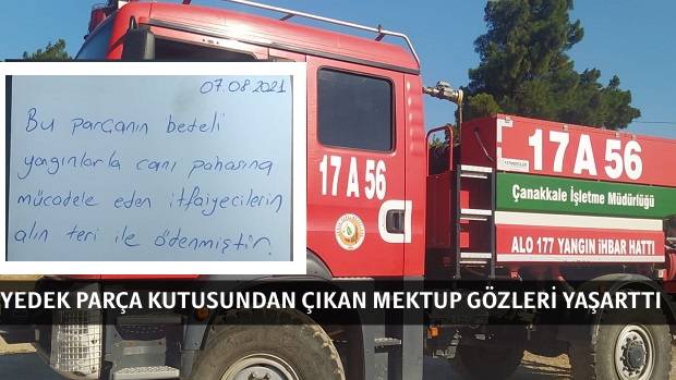 Çanakkale Orman İşletme Müdürlüğü bünyesinde bulunan 17 A 56 plakalı Arasöz arıza yapınca, yetkililer yedek parça telaşına düştü. Yangınlara karşı canı pahasına müdahale eden kahraman itfaiyecilerin imdadına yetişen bir esnaf, gönderdiği parçanın kutusuna iliştirdiği mektup hem sevindirdi hem de duygulandırdı.