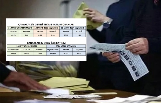 31 Mart 2024 tarihinde Çanakkale merkez ilçede 102 bin 869 seçmenden 80 bin 151’i sandığa giderek oy kullandı. Bin 921 seçmenin oyu ise geçersiz sayıldı. Çanakkale merkez ilçede sandığa gitmeyen seçmen sayısı ise 22 bin 718’e yükseldiği görüldü.