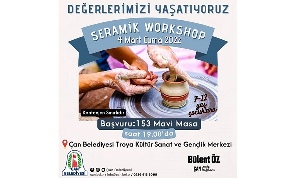 Çan Belediyesi, 7-12 yaş aralığındaki çocuklara yönelik eğlenceli bir etkinlik ortaya koymaya hazırlanıyor. Seramiğin kenti olarak bilinen ilçede, çocukların hem değerlerini yaşatmak, hem de eğlenceli vakit geçirmek için planlanan workshop, 4 Mart Cuma günü saat 19:00’da Çan Belediyesi Troya Kültür Sanat ve Gençlik merkezinde gerçekleşecek. Konuyla ilgili Çan Belediyesi tarafından yapılan açıklamada kontenjanların sınırlı olduğu ve kapsamlı bilgi için 153 – Mavi Masa birimleri ile iletişime geçilebileceği aktarıldı.