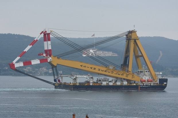 Çanakkale 1915 Köprüsü'nde Haziran ayı ortalarında montajına başlanacak olan, her biri 45 metre genişliğinde, 48 metre uzunluğunda ve 700 ton ağırlığındaki tabliye bloklarının montajında kullanılacak Singapur bayraklı 'Asian Hercules-III' isimli yüzer vinç, Çanakkale'ye geldi.