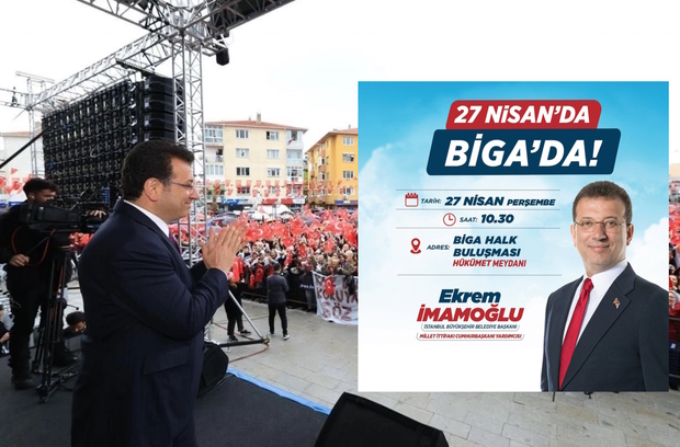 Millet İttifakı Cumhurbaşkanı Adayı Kemal Kılıçdaroğlu'nun Balıkesir Mitingi öncesi aynı gün (27 Nisan Perşembe) saat 10:30'da Bigalılar ile buluşacak. Ekrem İmamoğlu, Biga Kaymakamlığı önündeki Cumhuriyet Meydanı'nda Bigalılara seslenecek ve 14 Mayıs'ta gerçekleşecek seçimlerde Millet İttifakı Cumhurbaşkanı adayı Kemal Kılıçdaroğlu için destek isteyecek.