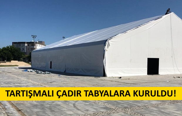 Cumhurbaşkanlığı İletişim Başkanlığına yakınlığı ile bilinen organizasyon şirketlerinden Haliç Medya Organizasyon şirketinin İskele Meydanında kurmak istediği 850 metrekarelik, 9 metre yüksekliğindeki gösteri çadırının Hamidiye Tabyalarına kurulumu tamamlandı.