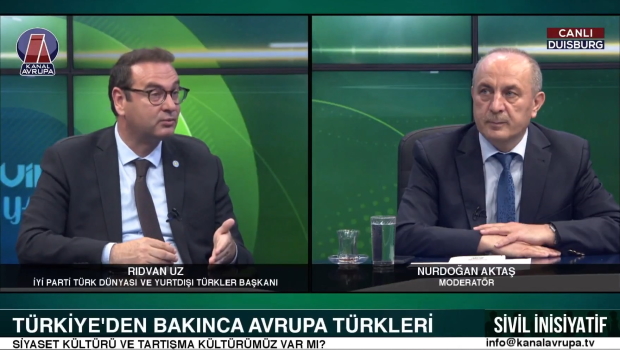 İYİ Parti Genel Başkan Yardımcısı, Türk Dünyası ve Yurt Dışı Türkler Başkanı Rıdvan Uz, Almanya'da merkezli Kanal Avrupa kanalında Nurdoğan Aktaş'ın sunduğu Sivil İnisiyatif programına konuk oldu. İYİ Partili Uz, "Yurt dışı milletvekilliği verilmesi için çalışmamız var. Biz bu konuda İYİ Parti olarak öncü olduğumuzu düşünüyoruz" dedi.