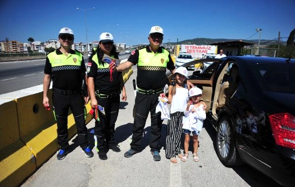 Çanakkale'de, 'Bu bayram ben de trafik polisiyim, hatalı sürücüye kırmızı düdük' projesi kapsamında, araçlardaki çocuklara kırmızı düdük, tişört ve broşür dağıtıldı.