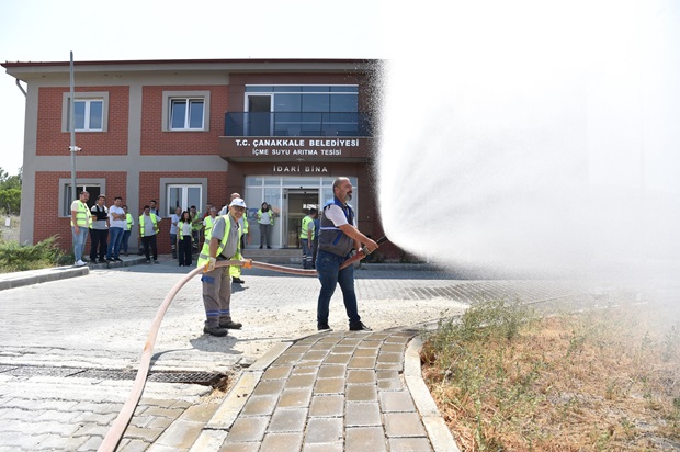 Çanakkale Belediyesi İtfaiye Müdürlüğü ekiplerinin koordinatörlüğünde, İçme Suyu Arıtma Tesisinde yangın tatbikatı gerçekleştirildi.