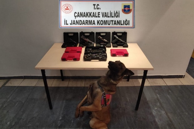 Çanakkale İl Jandarma Komutanlığı ekipleri silah kaçakçılığı ile mücadele doğrultusunda önceden takibe aldıkları bir adrese operasyon düzenlendi. Bomba arama köpeği Torba'nın da katıldığı operasyonda; 4 adet tabanca, 7 adet tabanca şarjörü, 9 adet 9mm tabanca fişeği, tabanca yapımında kullanılan namlu, pim ve yay gibi parçalar ele geçirildi. Operasyonda gözaltına alınan 1 şüpheli şahsın ise jandarmadaki işlemleri devam ediyor.