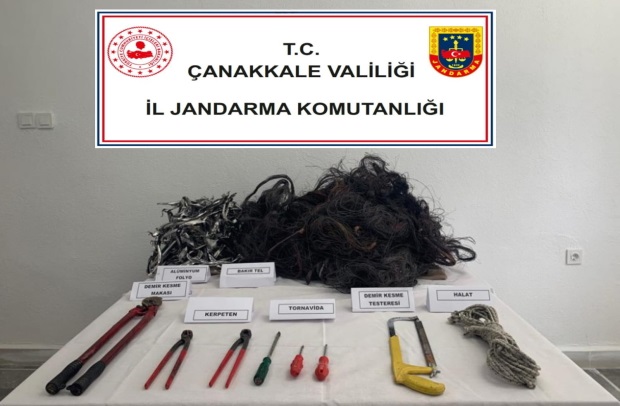 Çanakkale Merkez, Lapseki ve Bayramiç ilçelerinde haberleşme ve enerji nakil kablolarında yaşanan hırsızlık olaylarının ardından Çanakkale Cumhuriyet Başsavcılığı koordinesinde Çanakkale İl Jandarma Komutanlığı ekipleri harekete geçti. Son iki ay içerisinde yapılan operasyonlarda yaklaşık değeri 350 bin lira olan enerji nakil kablosu ve hat yapımında kullanılan malzemeler ele geçirildi. Aynı zamanda eş zamanlı olarak yapılan operasyonlarda 7 şüpheli yakalanarak haklarında adli işlemler başlatıldı.