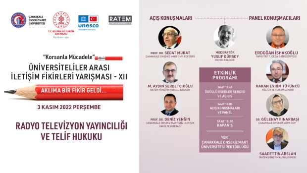 Çanakkale Onsekiz Mart Üniversitesi (ÇOMÜ) İletişim Fakültesi’nin ev sahipliği yapacağı, Kültür ve Turizm Bakanlığı, UNESCO Türkiye Milli Komisyonu ile RATEM’in Üniversitelerde gerçekleştirdiği ‘Radyo ve Televizyon Yayıncılığı ve Telif Hukuku Korsanla Mücadele Paneli 3 Kasım’da gerçekleştirilecek.   3 Kasım 2022 tarihinde düzenlenecek ve ÇOMÜ Sosyal Bilimler MYO Konferans Salonu’nda gerçekleşecek ‘Radyo ve Televizyon Yayıncılığı ve Telif Hukuku’ panelinde korsanla mücadele konusu ele alınacak.  RATEM Eski Yönetim Kurulu Başkanı Yusuf Gürsoy’un moderatörlük yapacağı panelin ardından RATEM’in “Aklıma Bir Fikir Geldi” başlığıyla bu yıl yarışmanın 12’ncisi düzenlenecek ve ödüllü eserler sergisi yapılacak.   ETKİNLİK PROGRAMI Saat 13.45_Ödüllü Eserler Sergisi ve Açılış Saat 14.00_Açılış Konuşmaları ve Panel Saat 15.30_Kapanış