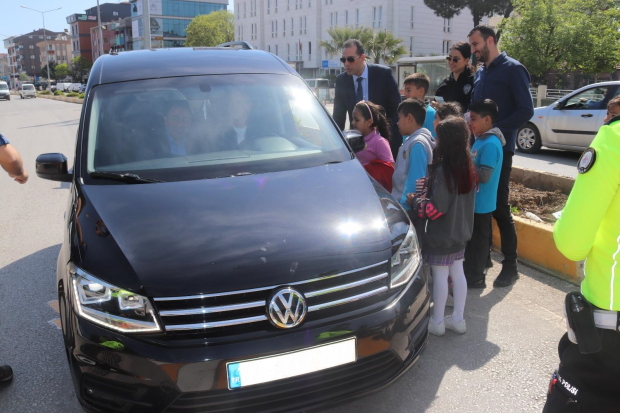 Bir süre trafik uygulamasına da katılan minikler emniyet kemeri ve yaya geçidi önceliği konusunda sürücüleri bilgilendirdiler. Biga İlçe Emniyet Müdürlüğü’nde toplantı odasına geçerek eğitici videolar izleyen minikler, hem bilgi sahibi oldular, hem de eğlendiler.