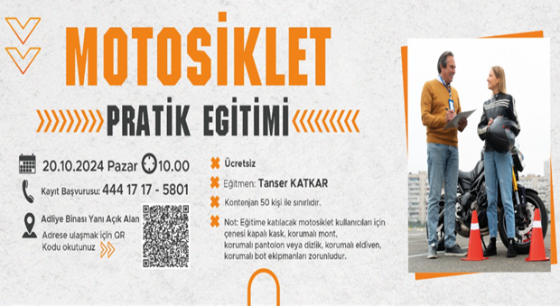 Motosiklet Çalıştayı’nın teorik eğitim bölümünün ardından trafiğe kapalı alanda planlanan pratik eğitim ise 20 Ekim 2024 Pazar günü saat 10.00’da Adliye Binası yanı açık alanda gerçekleşecek. Eğitmen Tanser Katkar tarafından verilecek olan uygulamalı eğitime 444 17 17 /5801 numaralı telefondan kayıt olunabilecek.