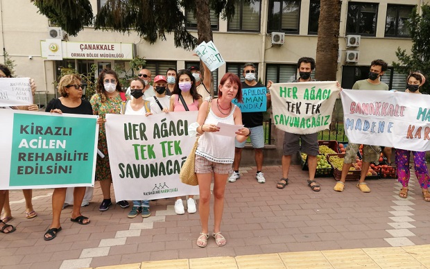 Çanakkale Orman Bölge Müdürlüğü önünde bir araya gelene Kazdağları Ekoloji Platformu üyeleri yetkililere çağrıda bulunarak bir an önce Ormanların her türlü ticari amaçla yapılan ağaç kesimlerine kapatılmasını istediler. Kazdağları Ekoloji Platformu’ndan yapılan açıklamada; “Türkiye cayır cayır yanıyor. Ormanlarımız içindeki yaşamla birlikte yok oluyor. Yetkililer bu felaket karşısında umursamaz ve sessiz. Ormanları koruması gereken Tarım ve Orman Bakanlığı, Çevre Şehircilik Bakanlığı, Orman Bölge Müdürlükleri ormanları, gerekli önlemleri almayarak ve yeterli müdahaleyi yapmayarak yangınlara teslim ediyor, maden ve enerji şirketlerine, turizm adı altıda yapılaşmaya peşkeş çekiyor. Artık tek bir ağacı bile kaybetme lüksümüz yok. Sesimizi duyun. Kaz Dağlarını ve ülkenin tüm ormanlarını her türlü ticari amaçla yapılan ağaç kesimlerine kapatın. Tüm maden ruhsatlarını geri çekin. Kirazlı gibi rant uğruna yok edilen ormanlık alanları acilen rehabilite edin” denildi.