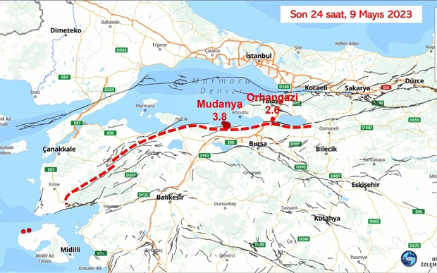 ÇOMÜ’den emekli jeoloji profesörü Doğan Perinçek, sosyal medyadan yine deprem uyarısında bulundu. Bursa’nın Orhangazi ve Mudanya’da meydana gelen depremlerini örnek gösteren Perinçek; “Batı Marmara da şeytan üçgeni içinde olan depremlerden sonra Orhangazi (2.6) ve Mudanya (3.8) depremleri Erdek, Biga ve Çan alanına enerji transferi yapmaya başladı. Kesikli kırmızıçizgi; bu alanda var olan ve enerji biriktirdiğine inandığım fayları belirgin kılmak için çizilmiştir. Son 24 saat içinde bölgede olan depremleri dikkatle izliyoruz” dedi.