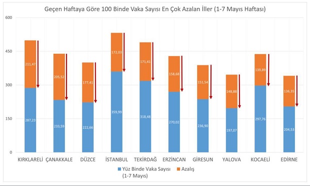 Sağlık Bakanı Fahrettin Koca, vaka sayısı en çok azalan illerin Kırklareli, Çanakkale, Düzce, İstanbul ve Tekirdağ olduğunu duyurdu.