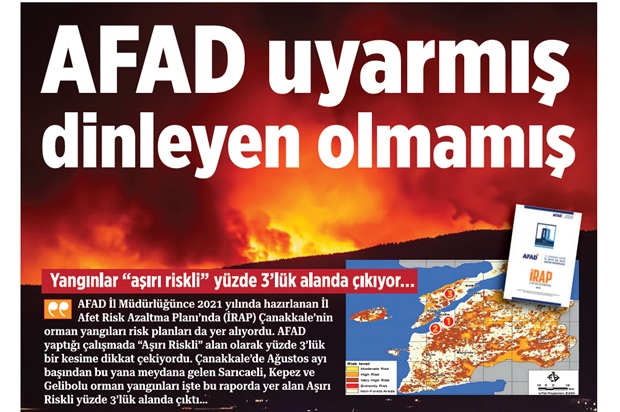 AFAD İl Müdürlüğünce 2021 yılında hazırlanan İl Afet Risk Azaltma Planı(İRAP)’nda Çanakkale’nin orman yangıları risk planları da yer alıyordu. AFAD yaptığı çalışmada “Aşırı Riskli” alan olarak yüzde 3’lük bir kesime dikkat çekiyordu. Çanakkale’de Ağustos ayı başından bu yana meydana gelen Sarıcaeli, Kepez ve Gelibolu orman yangınları işte bu raporda yer alan Aşırı Riskli yüzde 3’lük alanda çıktı!