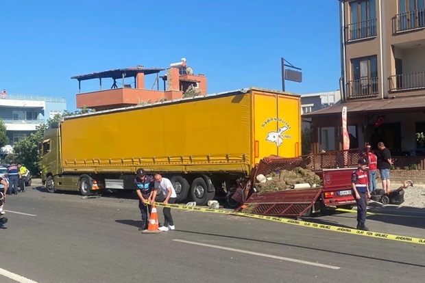Çanakkale'nin Ayvacık ilçesinde meydana gelen trafik kazasında kamyonet, önce otomobile ardından TIR'a arkadan çarptı. Kazada kamyonetin sürücüsü ve bir yolcu hayatını kaybetti.